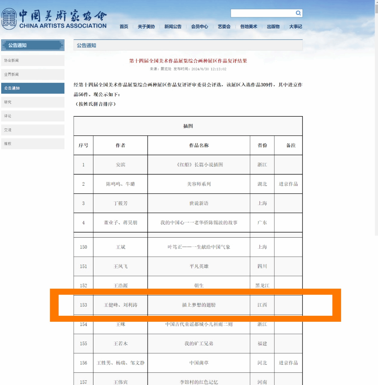 近日,第十四届全国美术作品展览综合画种展区作品复评名单公布,我校艺术学院教师王健峰、刘利涛合作的连环画作品《插上梦想的翅膀》入选。之前,我校艺术学院教师彭迅才副教授创作的作品《夜色阳明路9号》已入选第十四届全国美术作品展览中国画展区,我校教师作品入选全国美展创历史最好成绩。