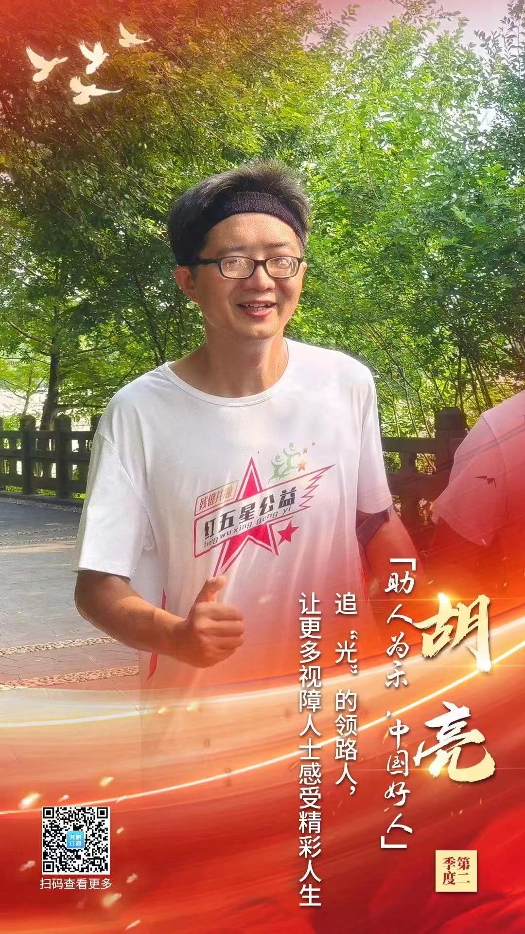胡亮,男,1984年5月生,井冈山大学副教授、美育中心副主任。作为一级视障人士,胡亮发起江西省首个“志愿者+视障人士”模式的红五星助盲跑团,每周坚持组织盲人朋友跑步健身,带领盲人朋友走出家门融入社会,被盲人朋友称为“盲人追光的领跑人”。截至目前,已带领百余名视障人士累计跑步1.5万公里,并推出全省首个无障碍美育服务——口述影像,将经典画作转为语音信息,满足视障人士“诗与远方”的想象,成为视障人士追“光”路上的领跑人。