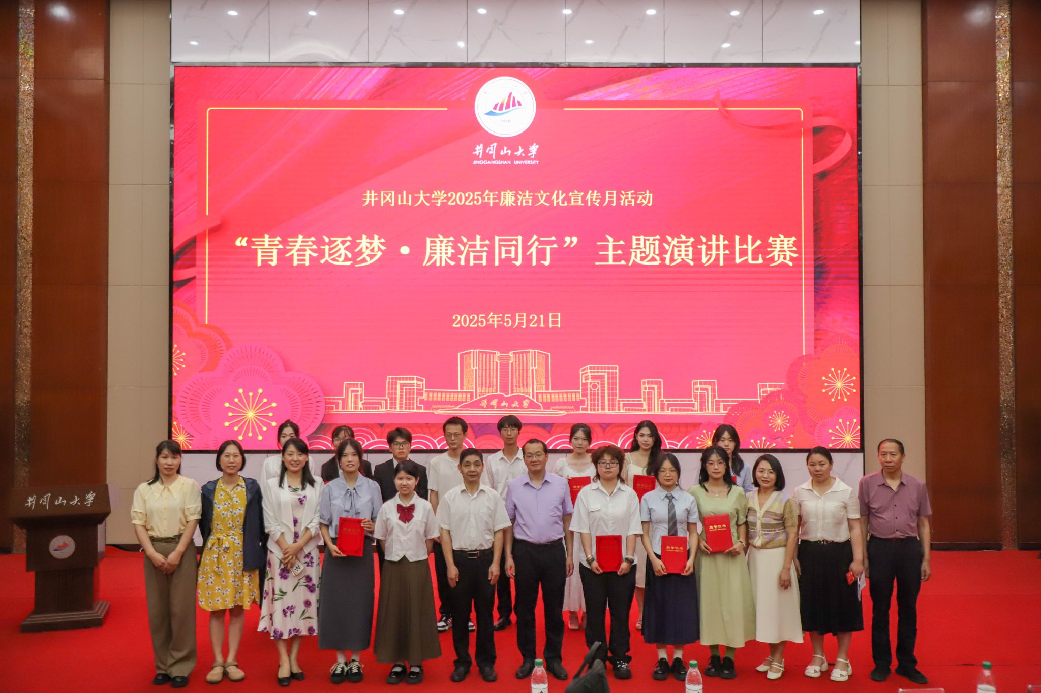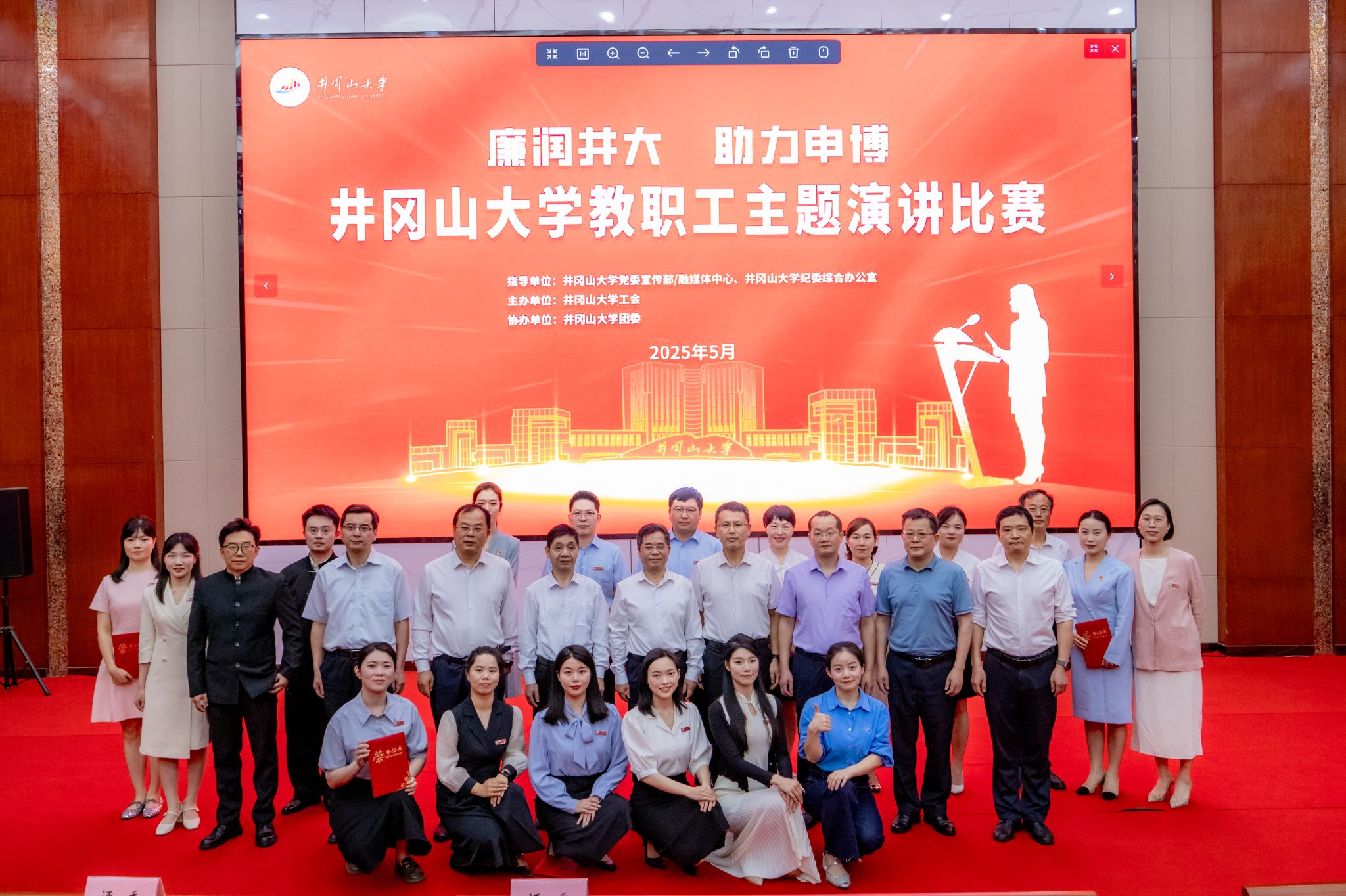 校纪委联合党委宣传部、工会、团委举办“廉润井大·助力申博”教职工演讲比赛,组织全校处级干部观摩,16组选手讲述申博攻坚中的廉洁事迹,传递校园廉洁文化魅力。评选出一等奖1名、二等奖2名、三等奖3名、优秀奖5名,并为人文学院、外国语学院、教育学院3个学院颁发优秀组织奖。