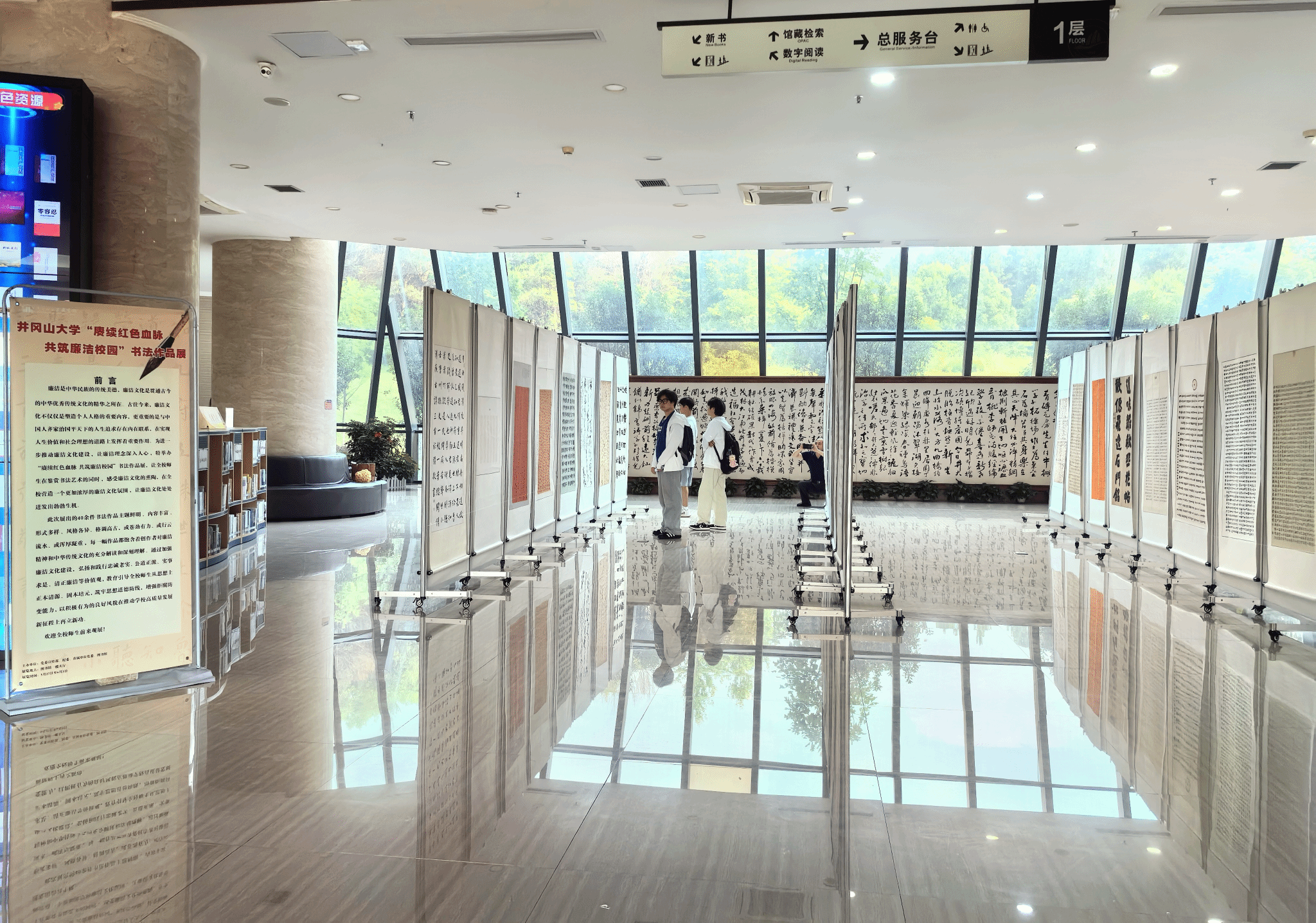廉洁文化月期间,艺术学院组织视觉传达设计,环境设计和美术学专业60余名师生参与设计创作,策划的廉政主题绘画设计展展出师生50余件作品在艺术学院5月27日,直属单位党委在图书馆举办“赓续红色血脉”书法展,40余幅作品以艺术形式传递廉洁精神。师生表示,艺术与廉洁教育结合强化了规矩意识。展览活动共吸引3000余人观展。师生现场给予高度评价,纷纷表示,用艺术的表现形式开展廉洁教育,在欣赏艺术作品的同时受到了深刻教育和警醒,增强了廉洁、纪律意识,有利于大家严守纪法规矩,扣好廉洁从教“第一粒扣子”。