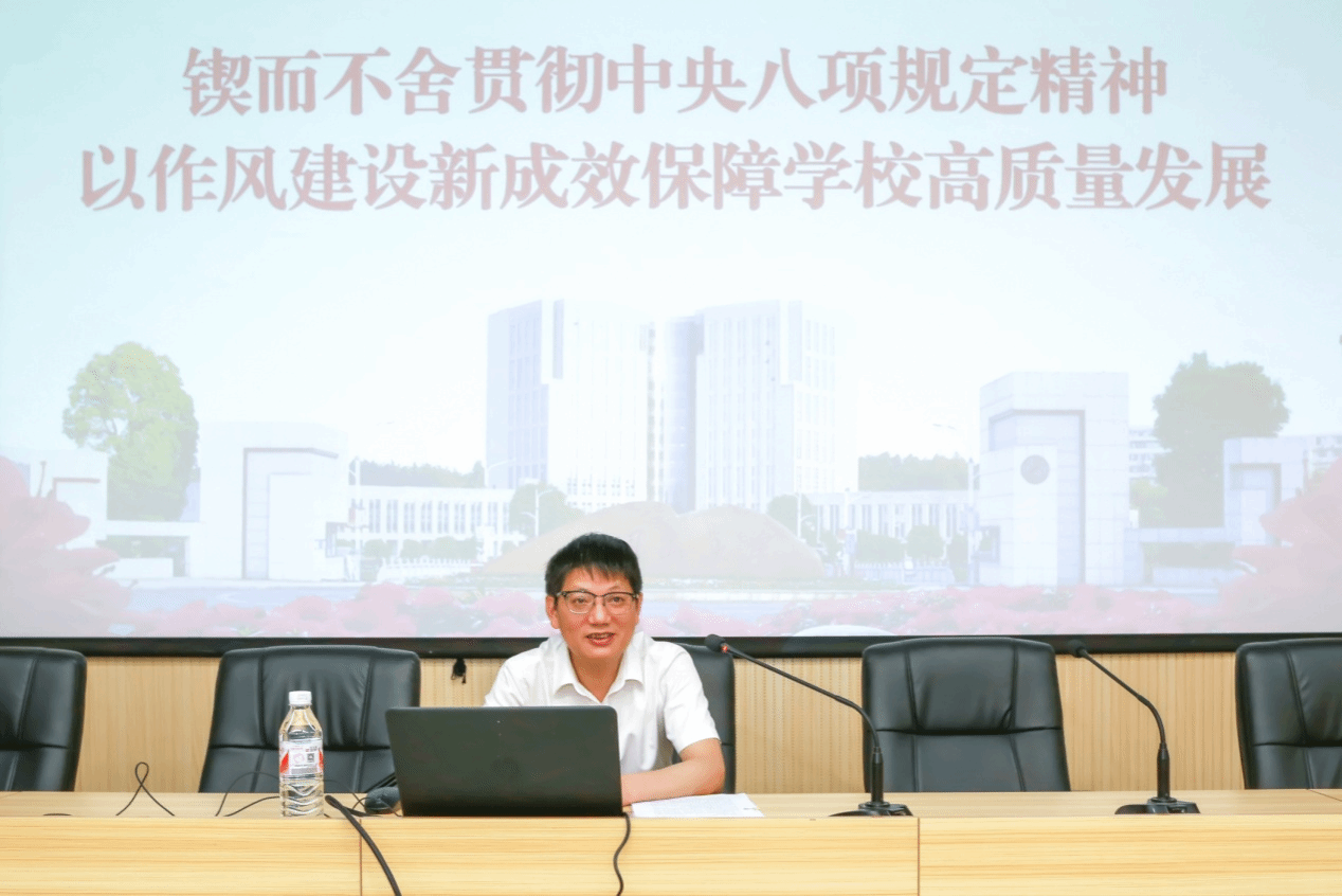 6月27日,学校党委副书记、校长罗旭彪在图书馆多功能厅,以《锲而不舍贯彻中央八项规定精神,以作风建设新成效保障学校高质量发展》为题,为各直属单位全体党员及科级以上领导干部上了一堂生动的专题党课。