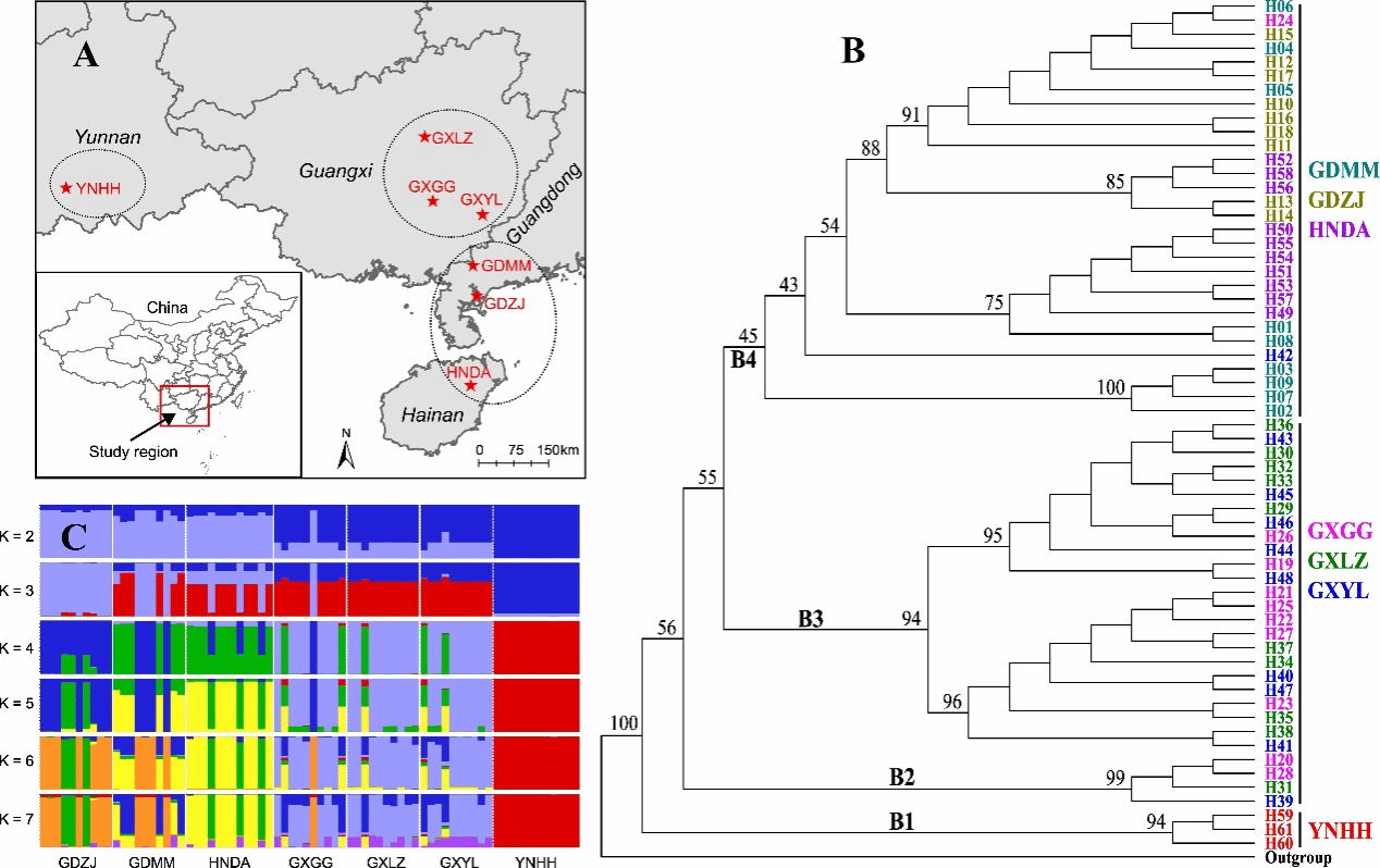 菲牛蛭分布于东南亚国家和我国南方省份,具有个体大、生长快、抗血栓活性强等优点,是最具价值的抗血栓类中药材之一。团队利用基因组测序技术和种群遗传学方法,对广东、广西、海南、云南等4个地区的7个菲牛蛭核心分布群体开展分子生药学研究。结果显示,菲牛蛭整体上具有丰富的遗传多样性,但在不同区域之间存在差异:广西地区的遗传多样性最高,广东和海南次之,而云南最低。遗传结构分析发现,云南省红河州种群(YNHH)最早分化,是最古老的群体;广西壮族自治区的贵港(GXGG)、柳州(GXLZ)和玉林(GXYL)种群遗传关系接近,但也存在少量相对原始的单倍型;广东省的茂名(GDMM)、湛江(GDZJ)和海南省的定安(HNDA)群体最晚分化,两省之间遗传分化程度不高。本研究首次证明云南省具有野生菲牛蛭遗传资源,推测云南省是我国牛蛭属的起源中心和药源中心。研究同时发现,琼州海峡对菲牛蛭的遗传隔离效应较弱,可能与末次冰期海平面下降从而形成大陆桥有关。本研究为菲牛蛭遗传资源保护与利用提供重要基础资料,为菲牛蛭抗血栓药用开发和药材道地性评价提供关键科学依据。井冈山大学林恭华教授为论文第一作者,江西师范大学唐利洲教授和井冈山大学赵芳副教授为通讯作者。