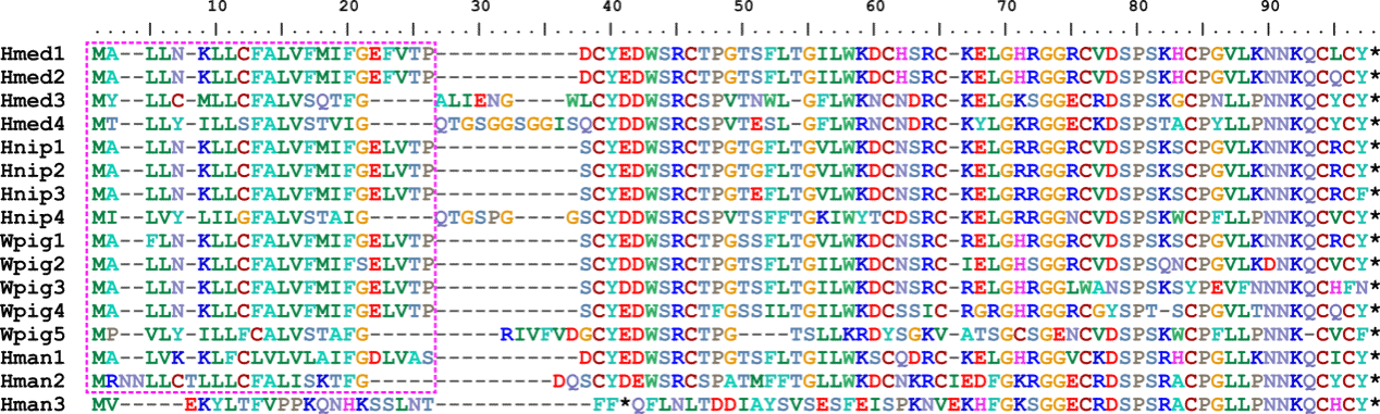 图3. 菲牛蛭及其近缘物种的macin多肽序列变异