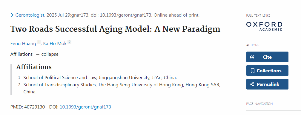 近日,我校政法学院黄锋博士联合香港恒生大学莫家豪教授在国际社会老年学领域知名期刊Gerontologist在线发表题为“Two Roads Successful Aging Model: A New Paradigm”的论文,我校为论文第一单位和唯一通讯单位。Gerontologist创刊于1961年,是美国老年学会(Gerontological Society of America,GSA)的会刊,由牛津大学出版社出版,属于中科院医学大类二区,老年医学(社科)一区和JCR一区期刊。