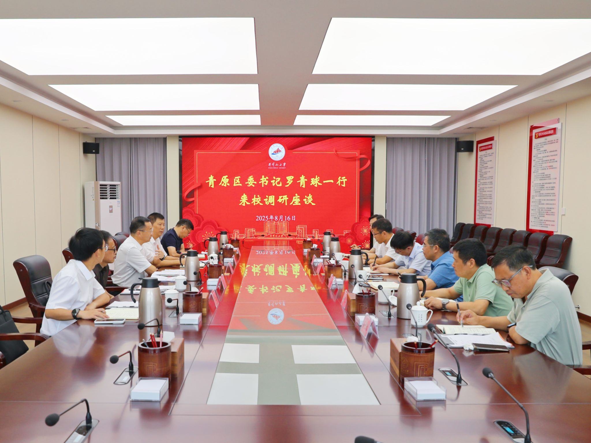 8月16日上午,青原区委书记罗青球一行来校调研座谈。校党委书记罗旭彪主持会议,党委副书记肖宜安,党委常委、副校长冷明,党委常委、组织部部长梁景宏,青原区委常委、宣传部部长朱赞华出席,青原区发改委、教体局、区委办以及我校相关部门主要负责人参加会议。
