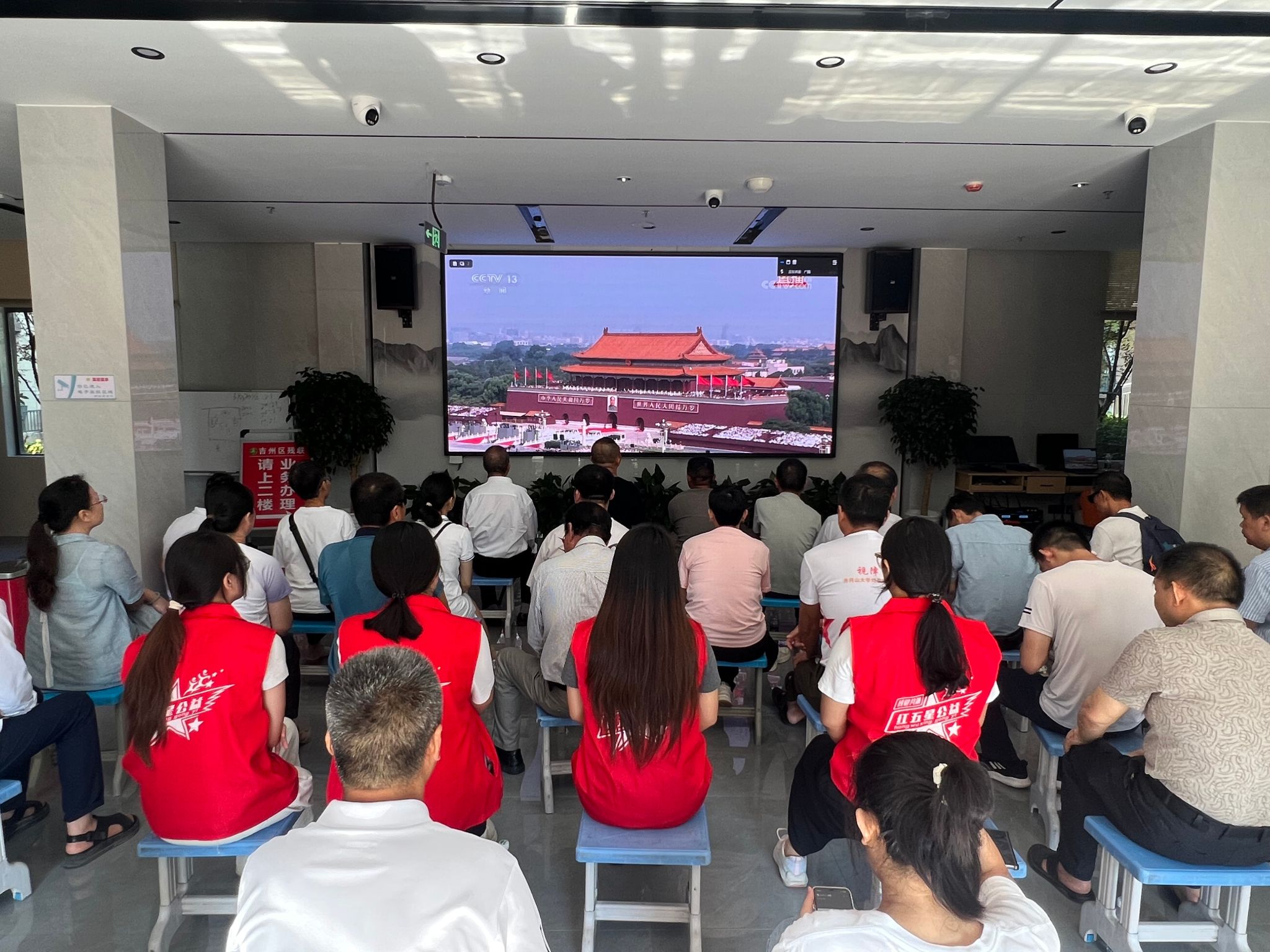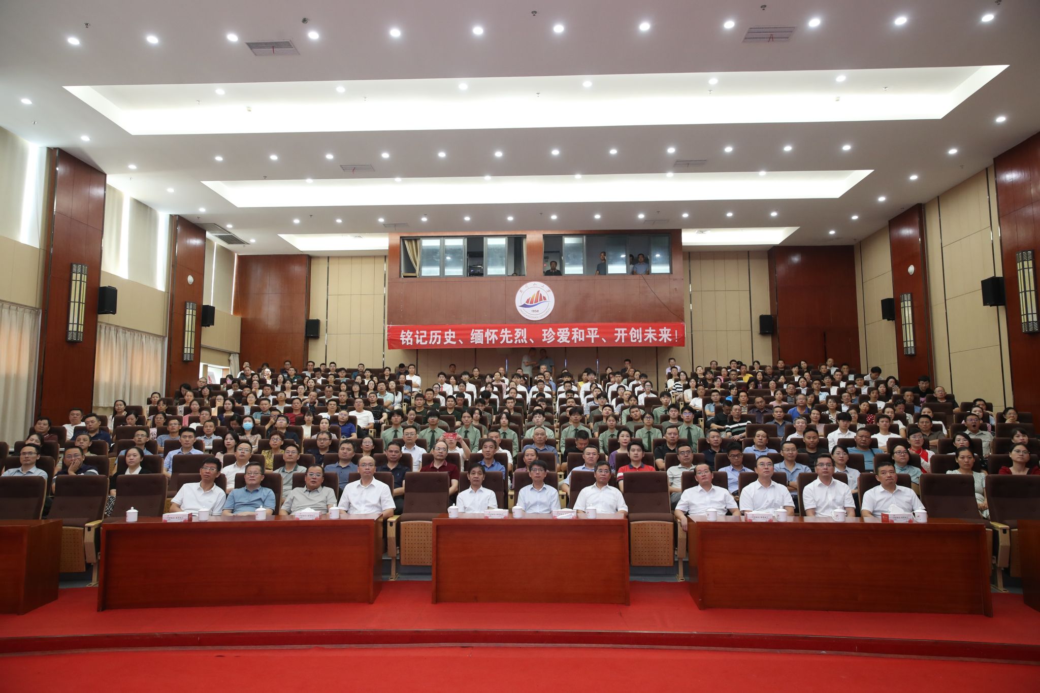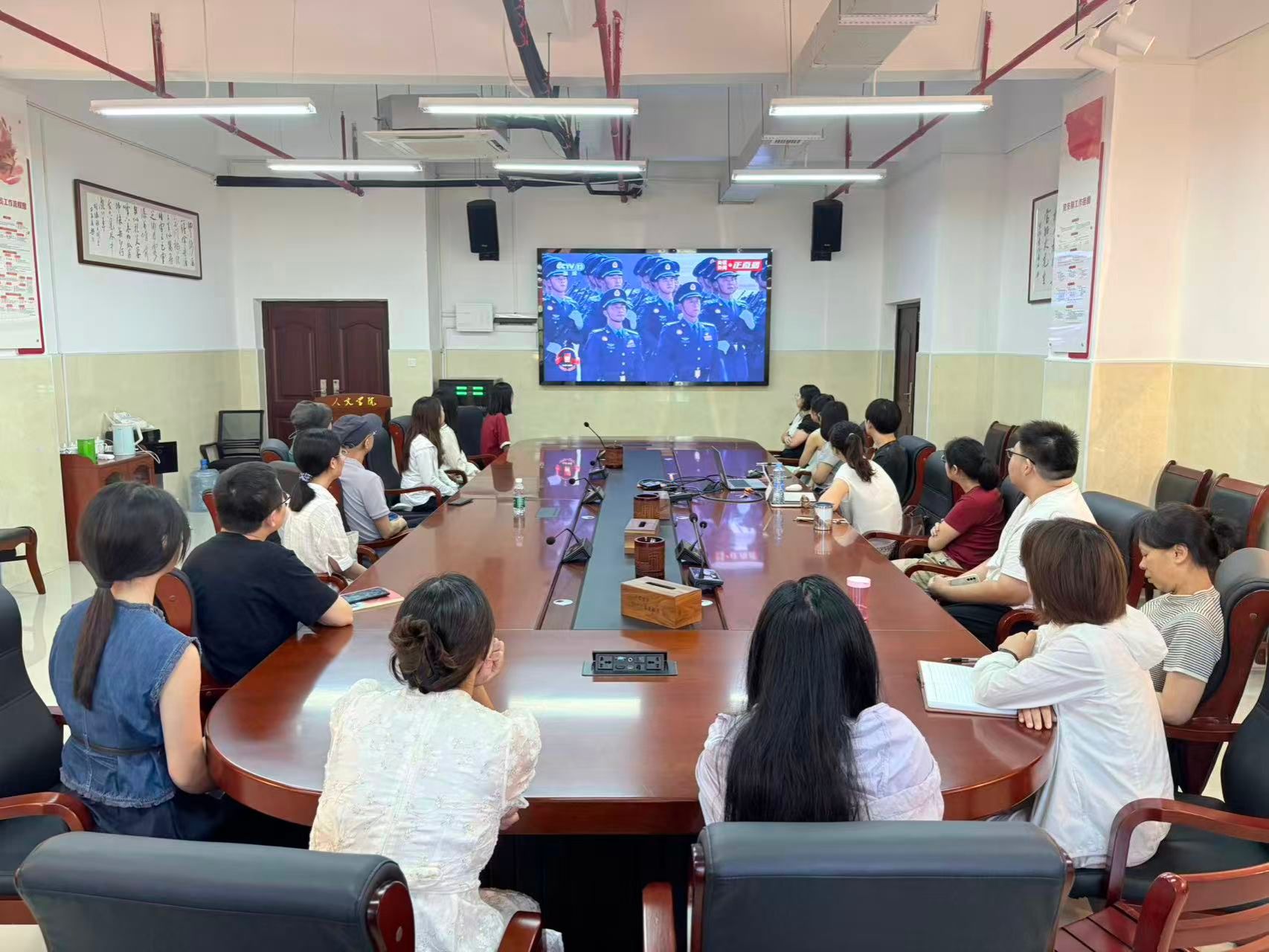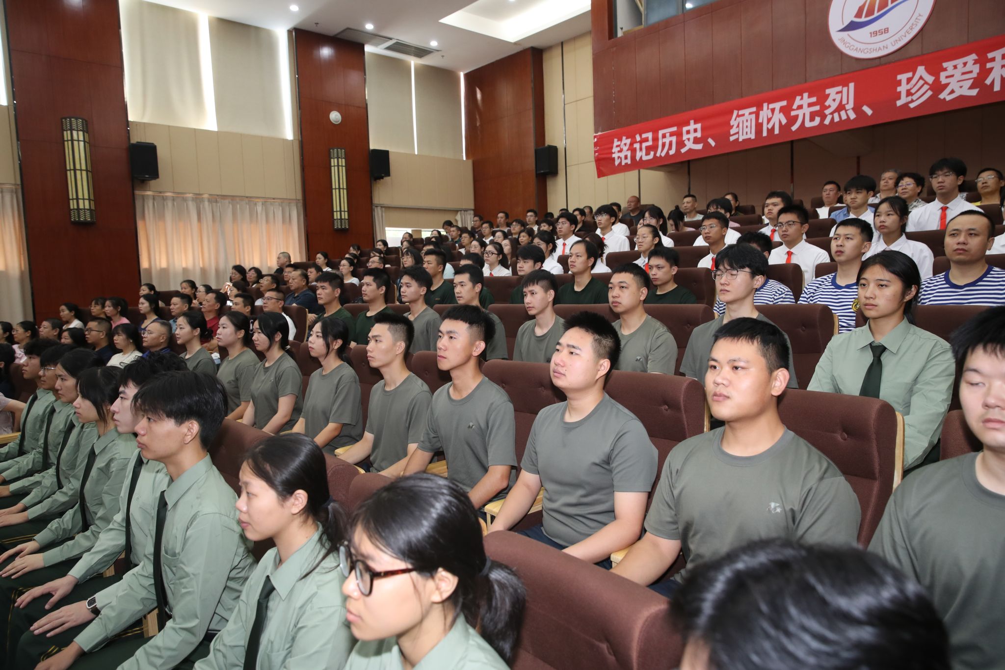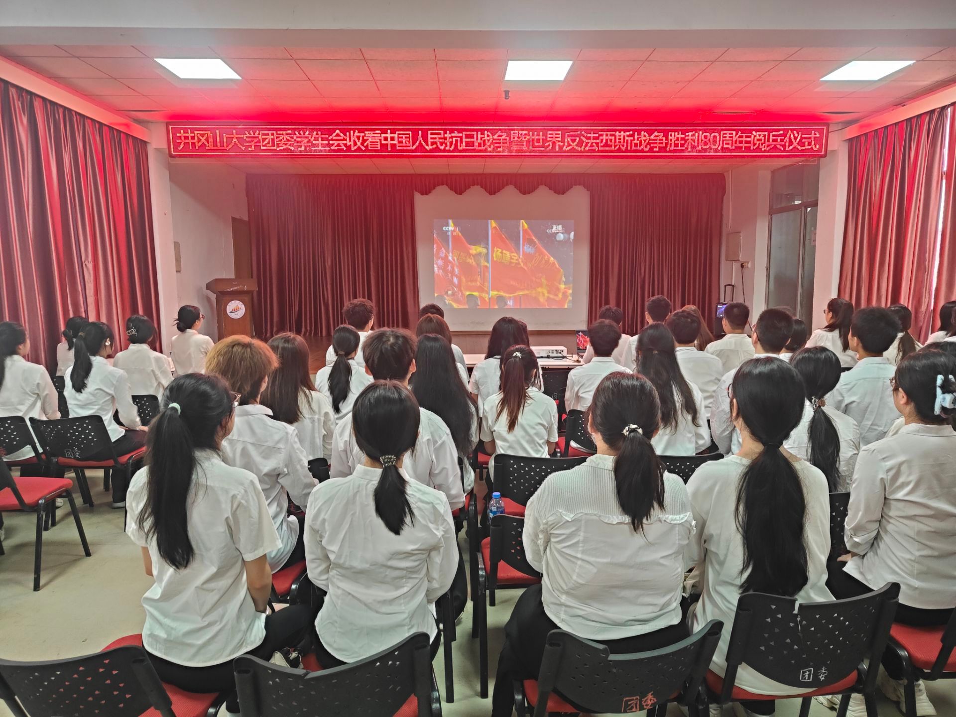 在图书馆学术报告厅主会场,全体在家的校领导与干部职工、退役军人、红色励志班学子集中收看仪式。