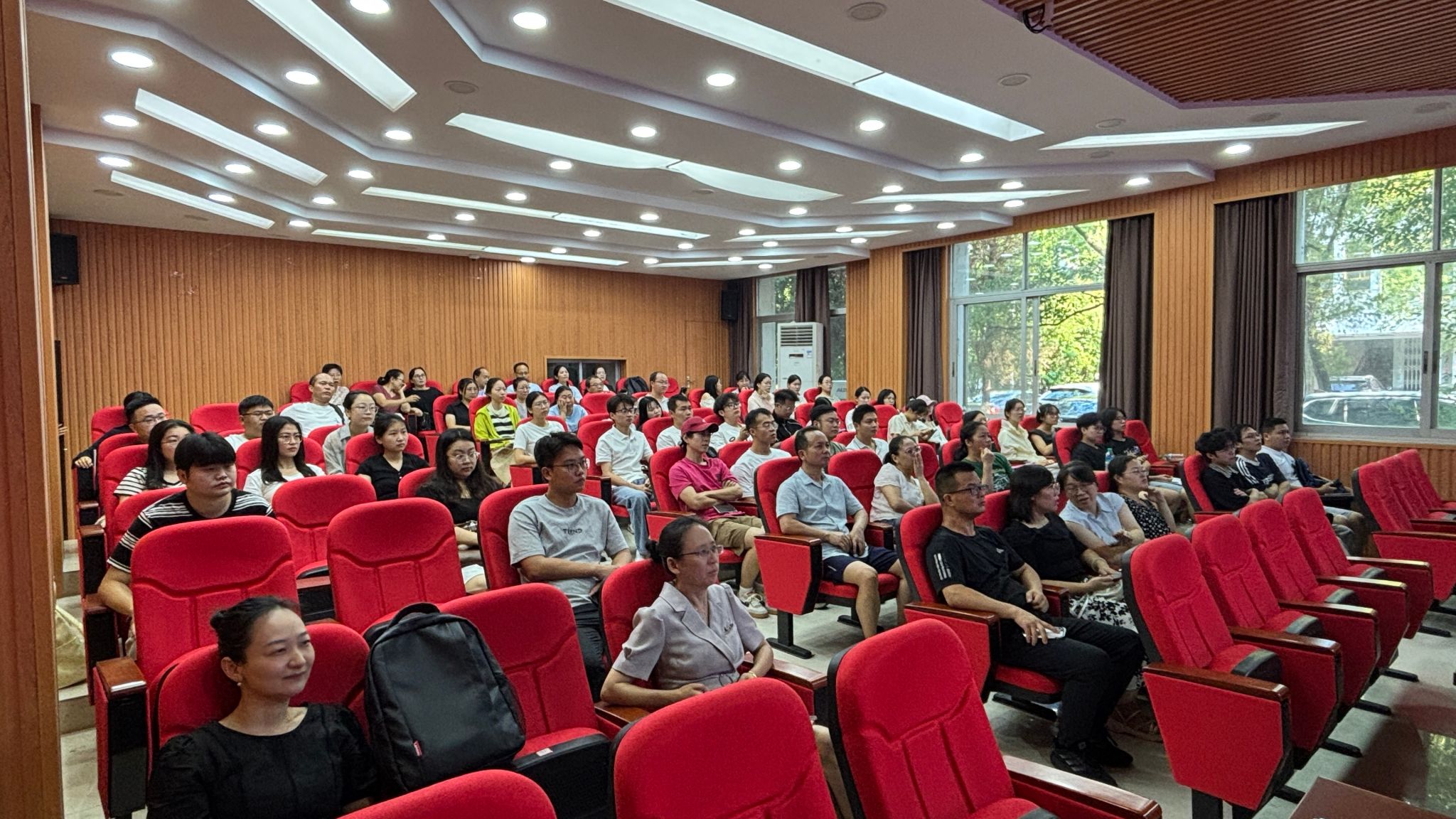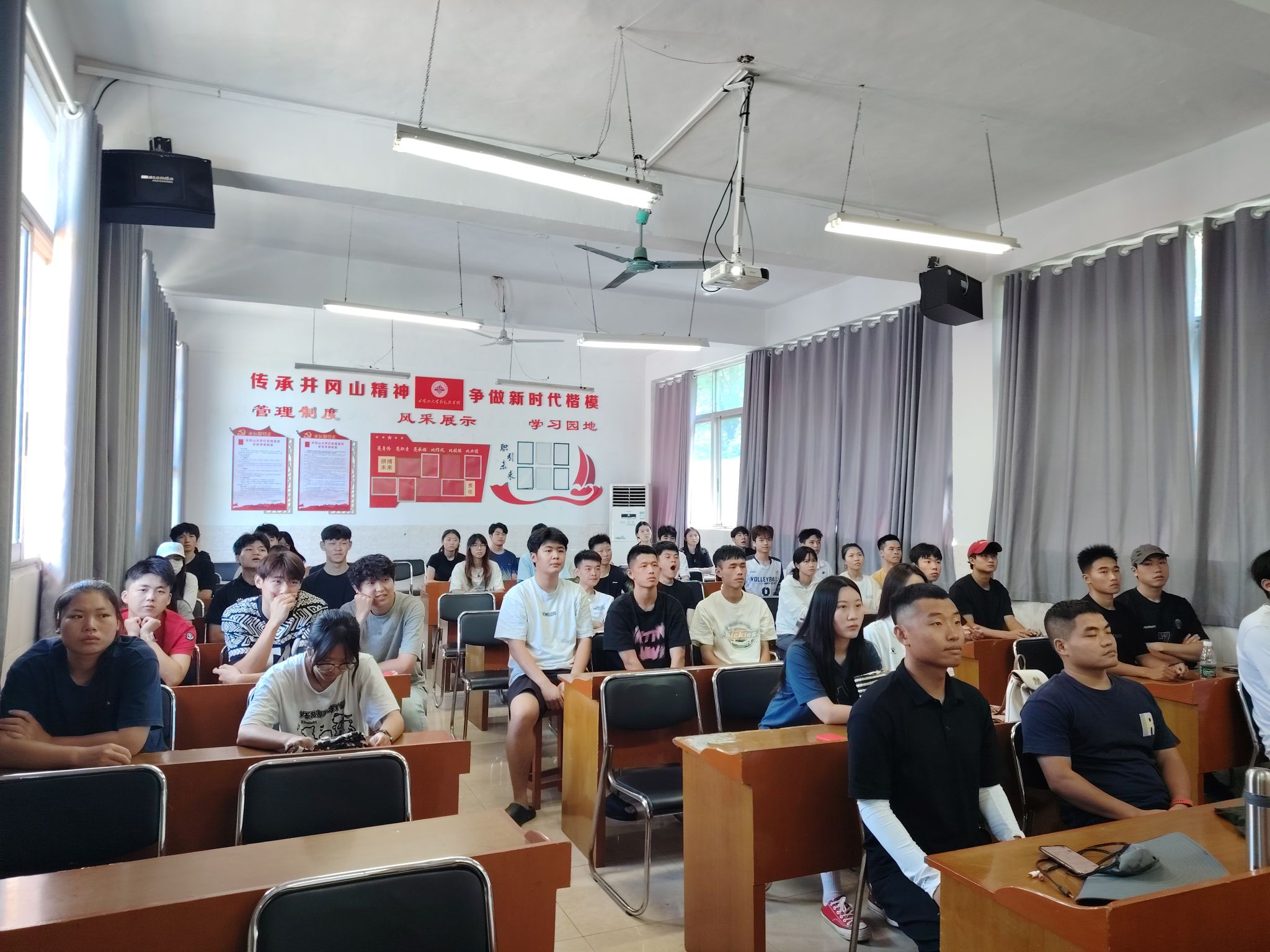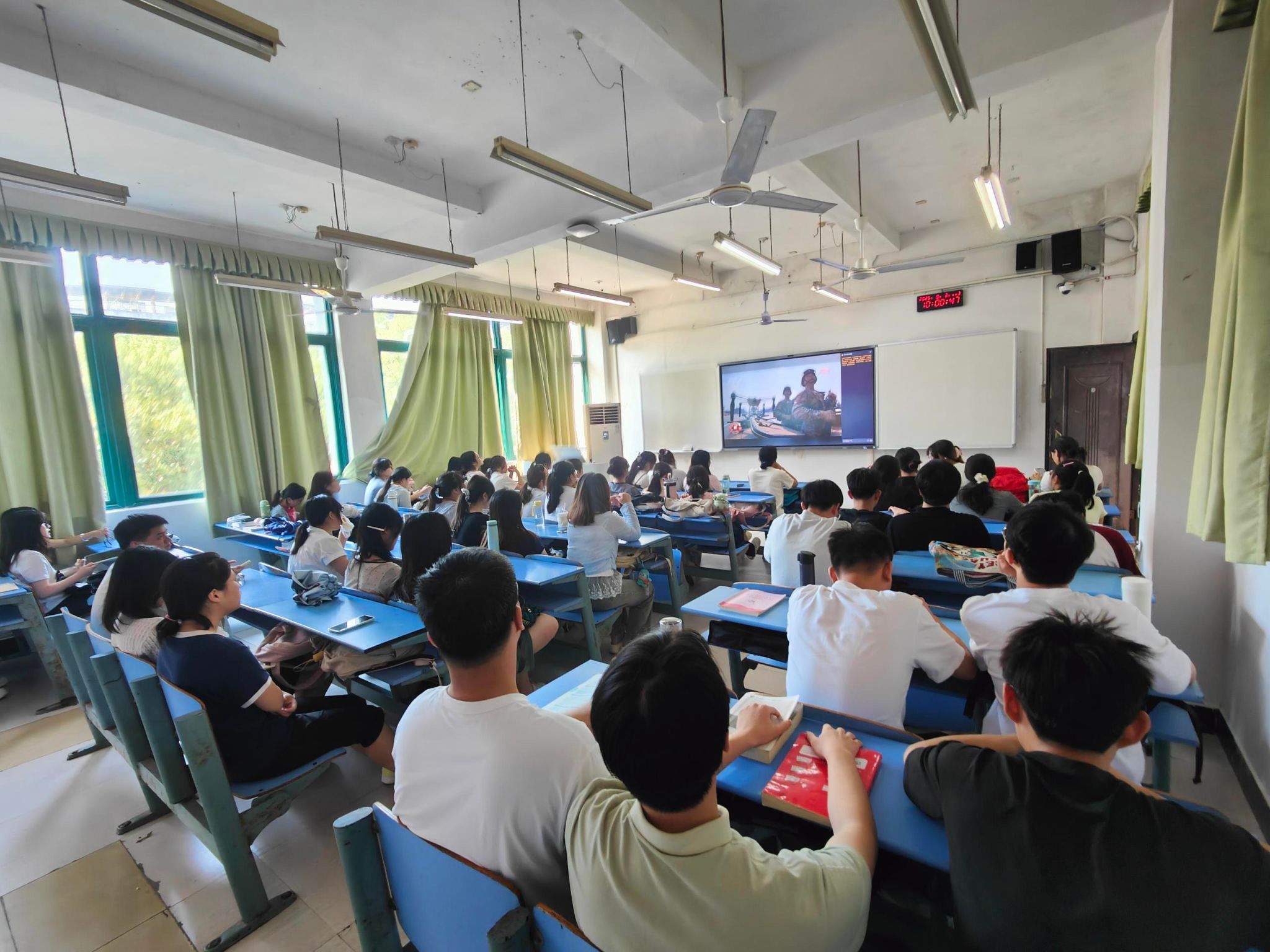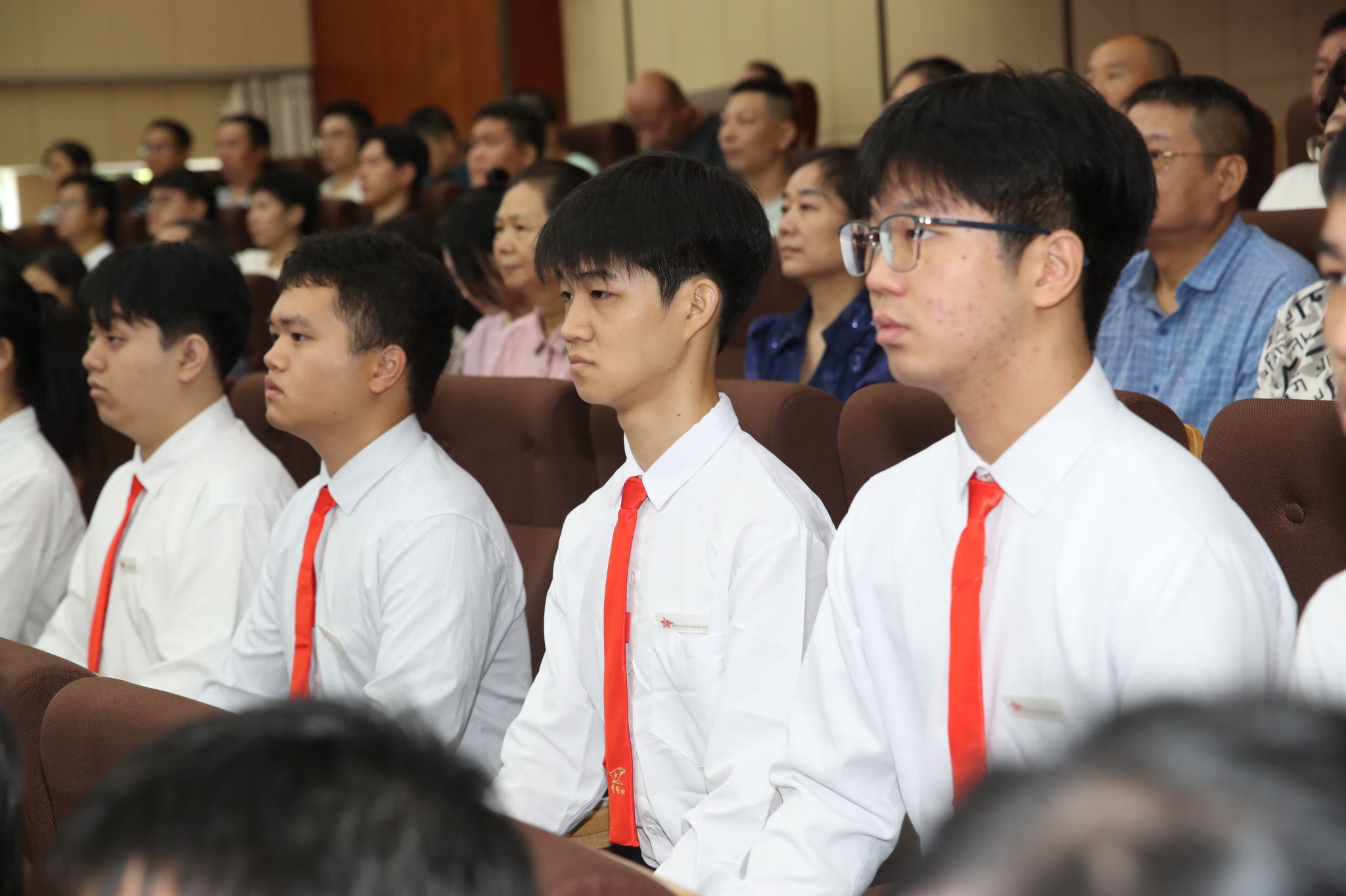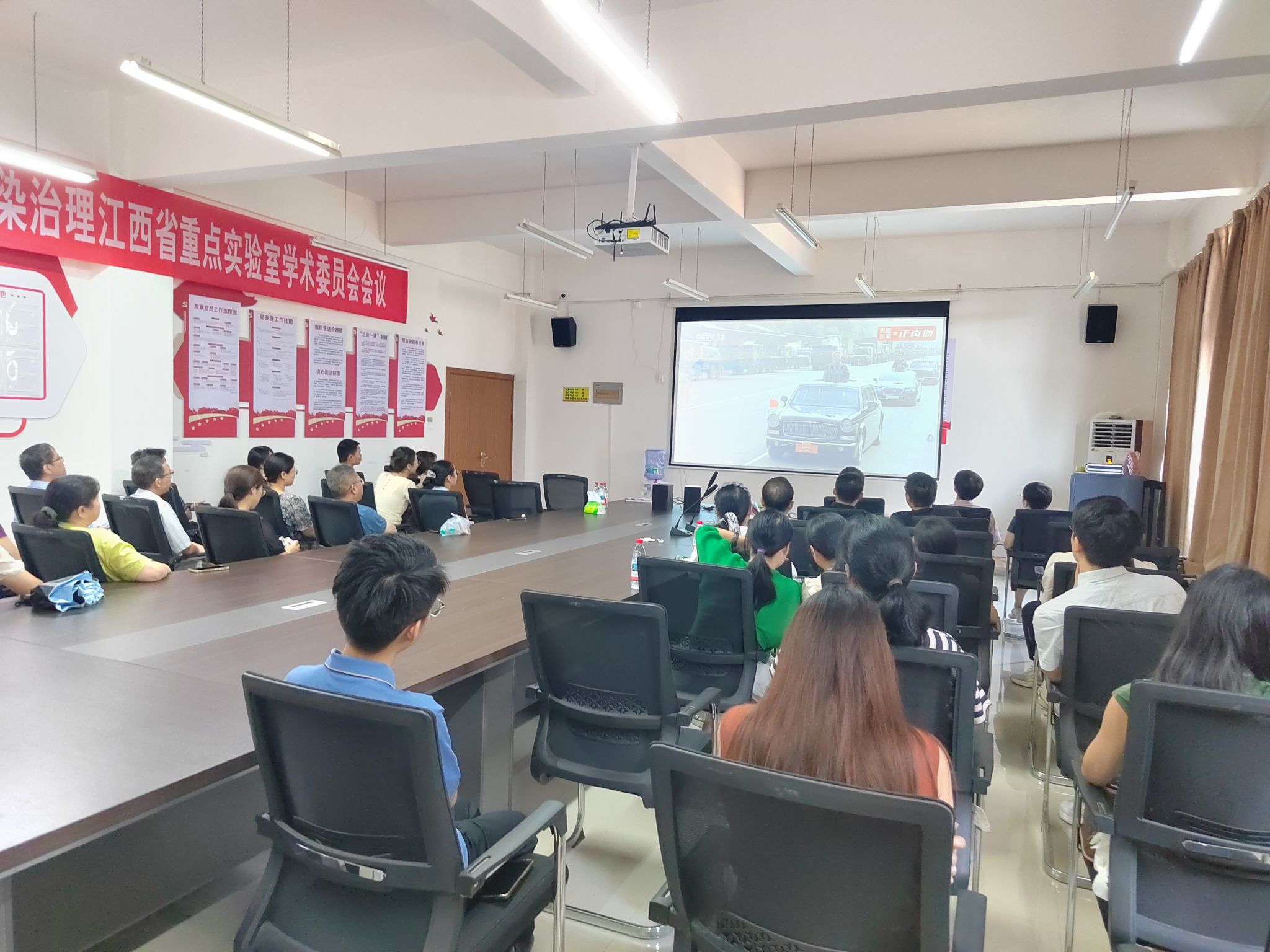 在图书馆学术报告厅主会场,全体在家的校领导与干部职工、退役军人、红色励志班学子集中收看仪式。