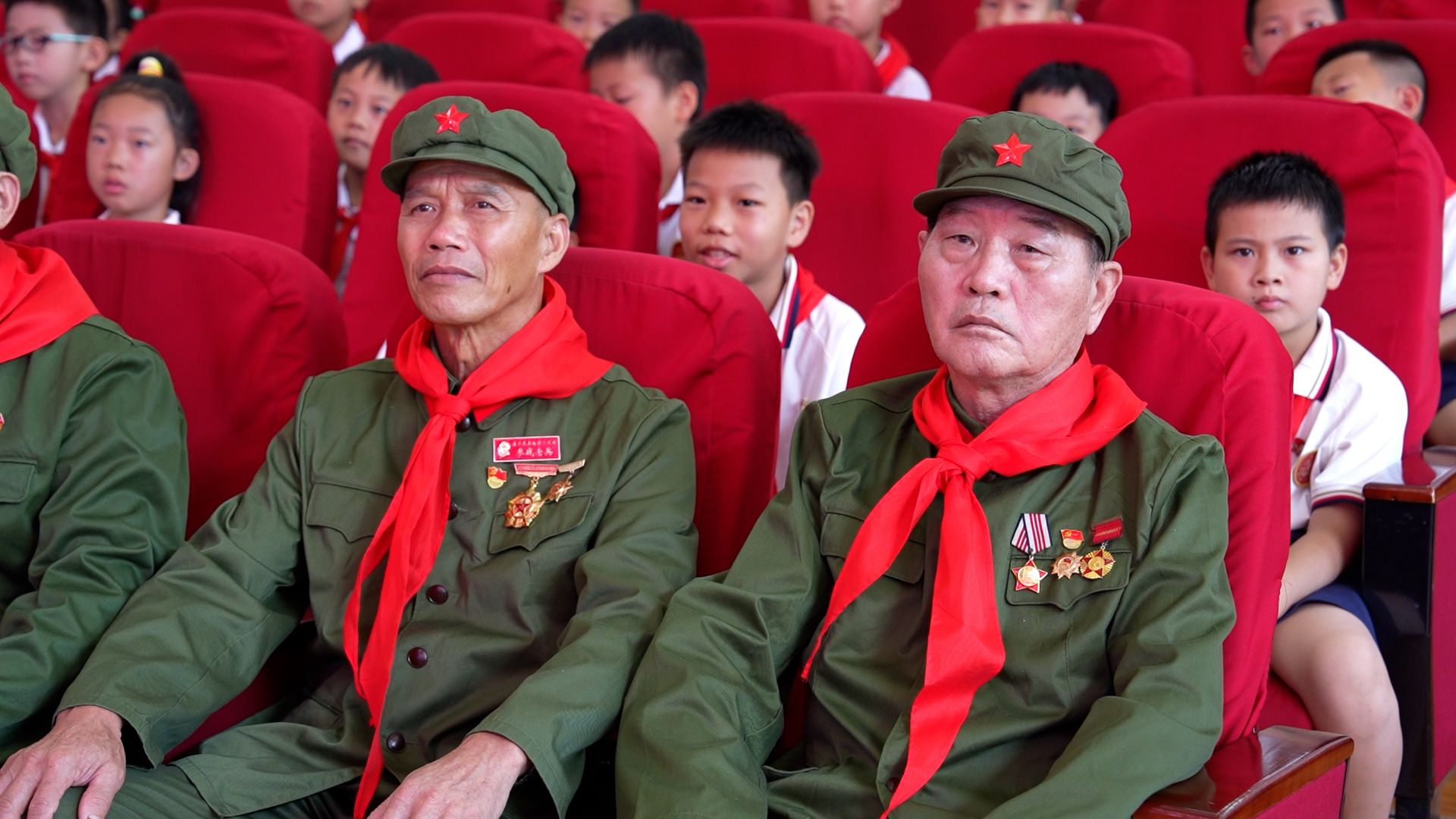 退役老兵、学校退休教师刘槐荫在吉师附小与师生们共同观看仪式并接受少先队员献上的红领巾。