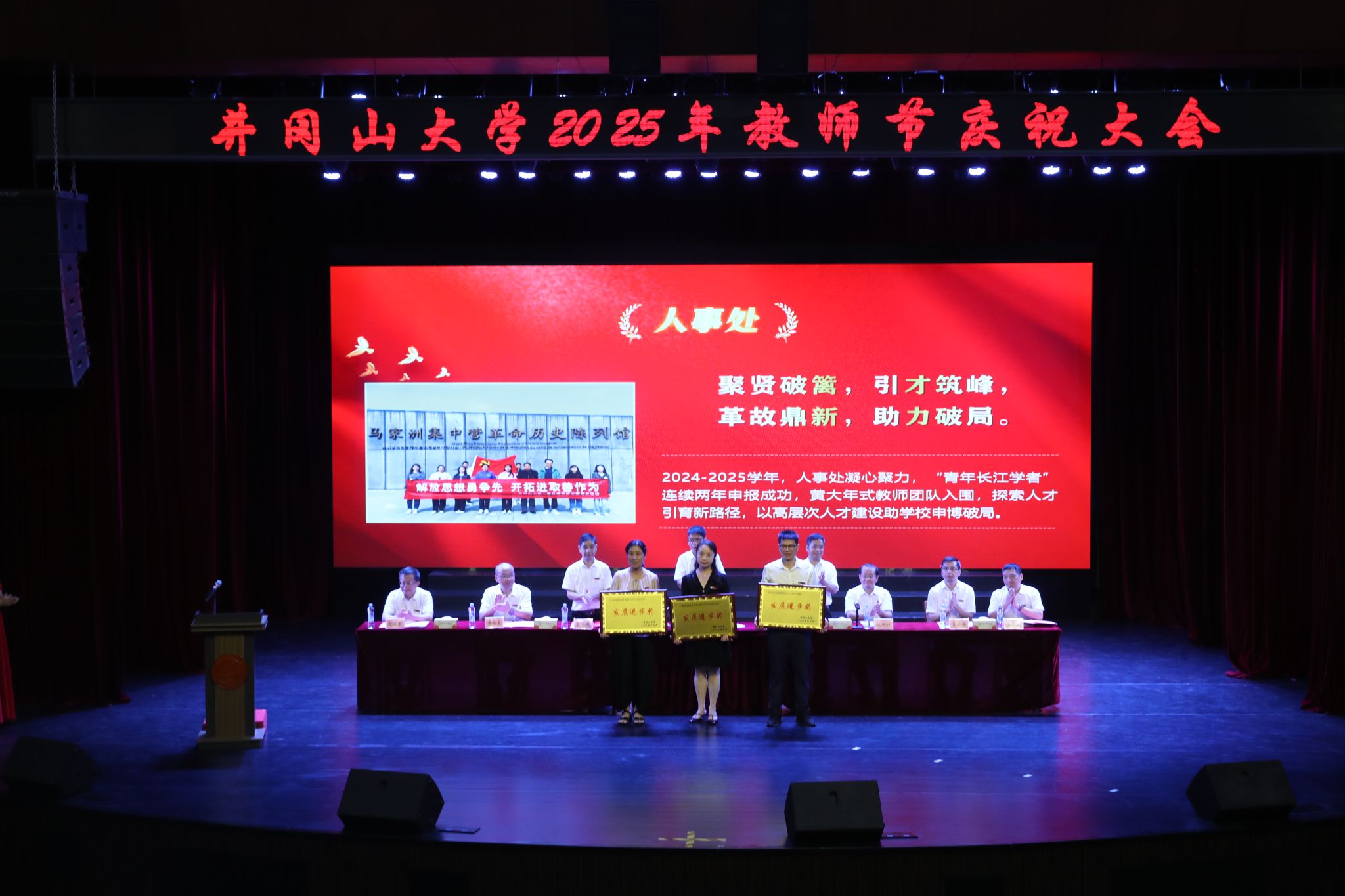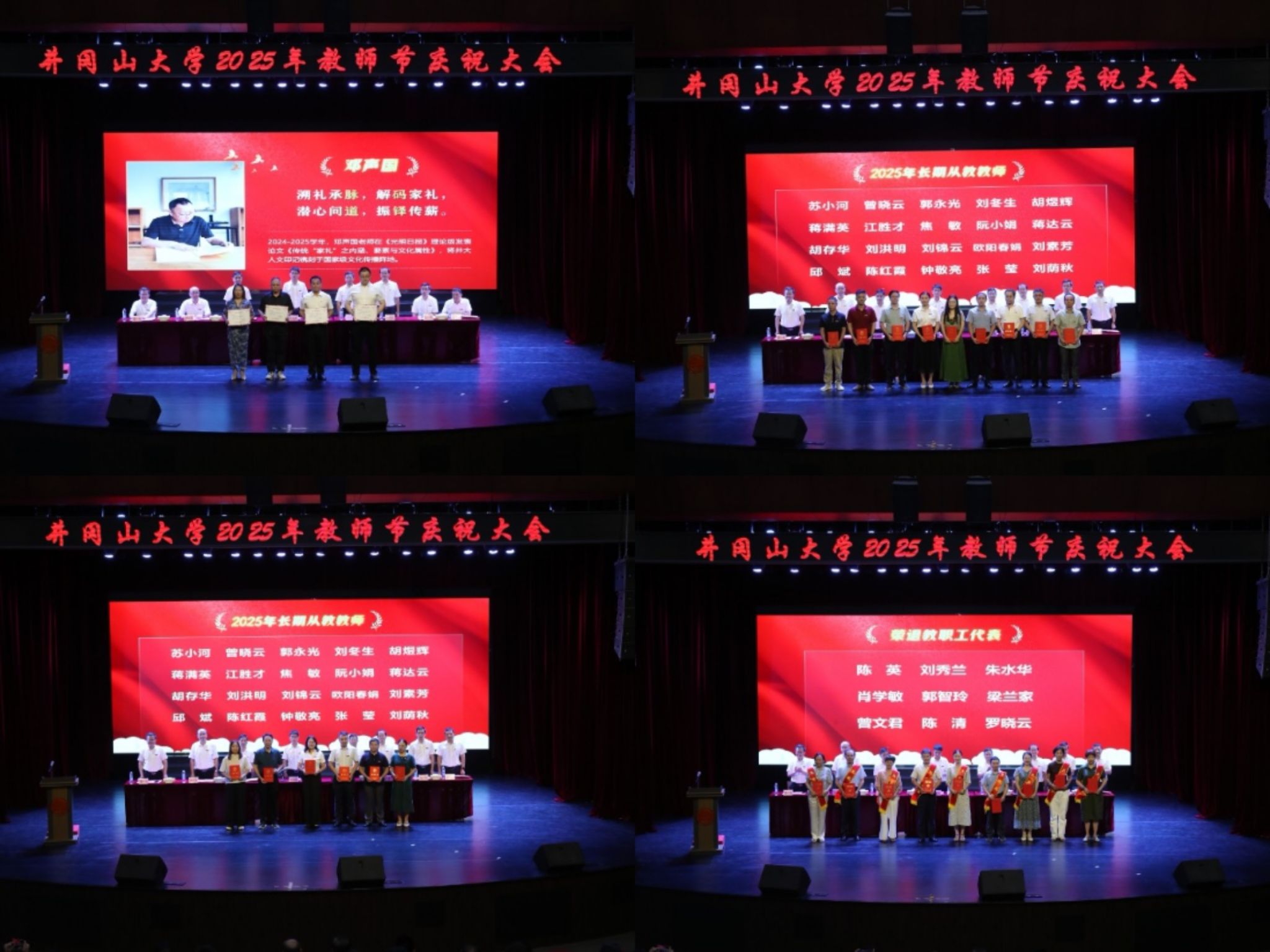 表彰环节,肖宜安通报了2024-2025学年我校集体和个人获得各类表彰情况。党委常委、纪委书记彭西洪宣读了《关于表彰井冈山大学2024-2025学年“发展进步奖”“突出贡献奖”获得者的决定》;副校长敖四江宣读了2025年长期从教教师名单。发展规划处等三个单位获发展进步奖,杨利明等四位获突出贡献奖个人,苏小河等二十名长期从教教师代表受到了大会的隆重表彰。同时大会还为坚守与奋斗了一辈子、即将开启退休生活的九名退休教职工代表颁发荣退证书,佩绶带。
