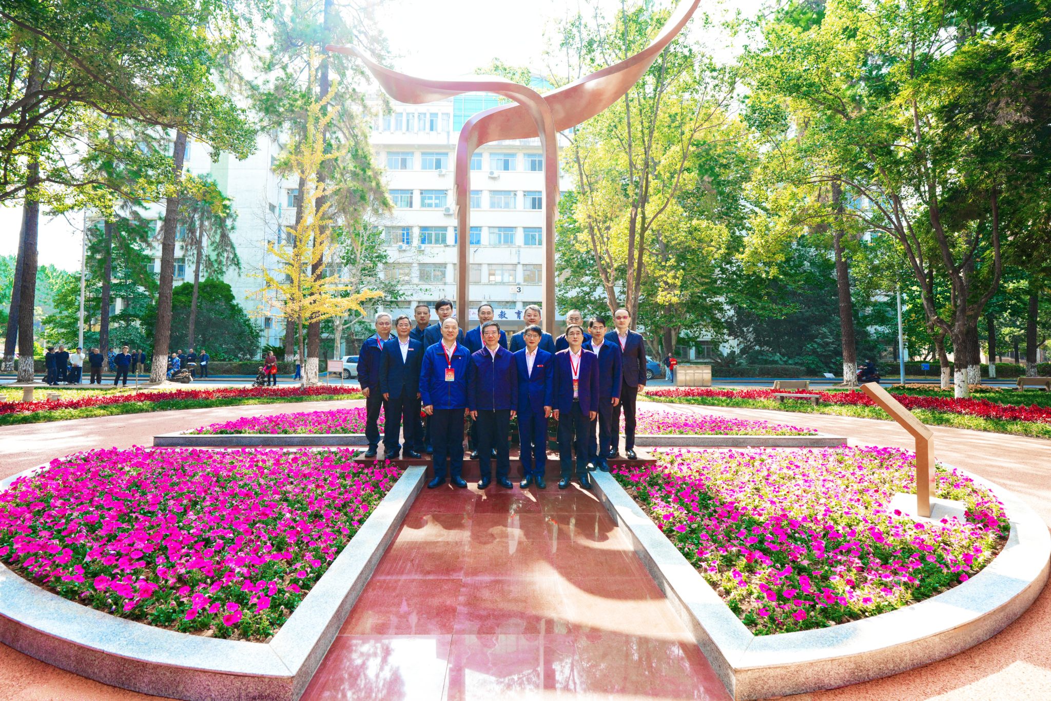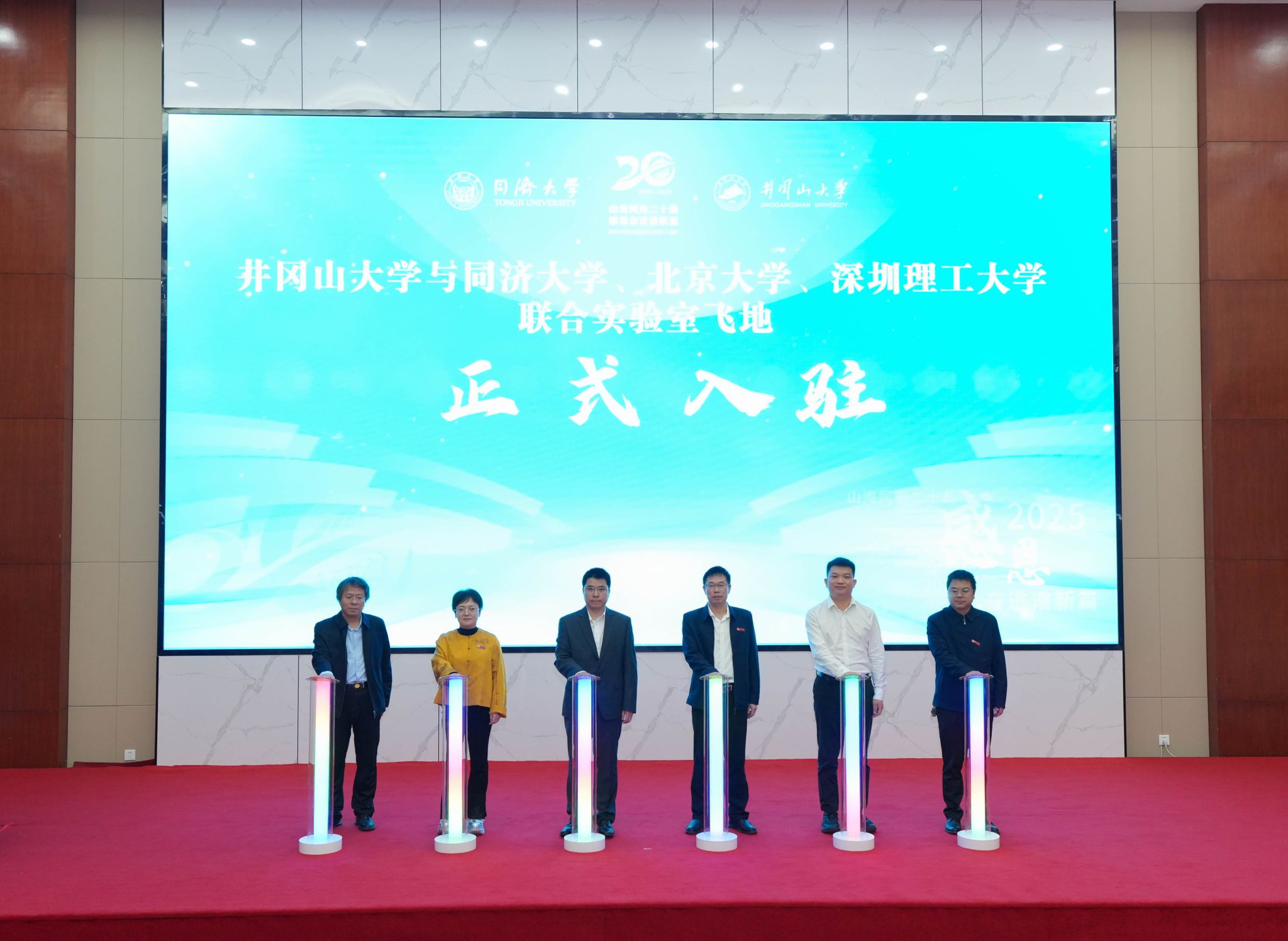 当天上午还举行了同济大学对口支援井冈山大学二十周年纪念雕塑揭幕仪式,刘润与罗旭彪共同按下启动柱,为名为“腾飞”的纪念雕塑揭幕。该雕塑以“幼苗”为型,高6.7米呼应井大建校67周年,基座20公分象征二十年合作积淀,中部“时光之门”镌刻两校校徽、校训及对口支援大事记,寓意两校携手奋进、共启未来。