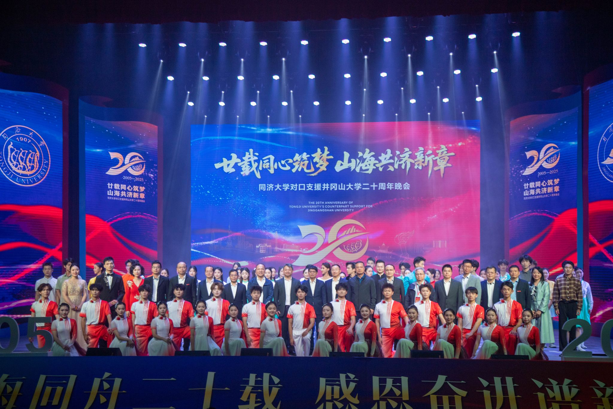 当晚,同济大学对口支援井冈山大学二十周年晚会在井冈山大学学生会堂精彩上演。晚会以“山海同舟二十载 感恩奋进谱新篇”为主题,通过“山海相逢”“同心硕果”“再启新程”三个篇章,用光影、舞蹈、诗音画等多种艺术形式,回溯两校二十载协作历程,生动展现山海携手、薪火相传的深情厚谊与奋进姿态。晚会还举行了两项特别的仪式:肖宜安为历任校助颁发了突出贡献奖,双方校领导登台举行《未来之约》仪式,为“未来之树”浇灌黄浦江水和赣江水,象征两校跨越山海的情谊生根、梦想发芽。
