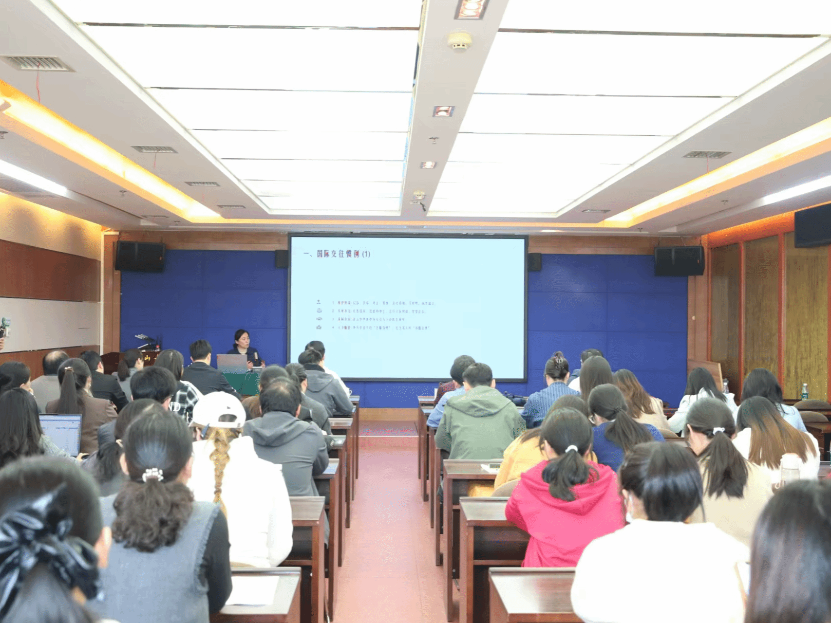 下午,谢涵芳为我校师生开展外事礼宾专题培训。肖洪海主持培训会,各学院(部)分管外事院领导、外事秘书,宣传部、国际合作与交流处、外国语学院、人文学院师生共70余人参加。谢涵芳结合自身丰富的外事外交实践经验,从接待流程及方案、国际交往礼仪等四个方面进行系统讲解。她列举典型案例生动阐释外事工作“坚守核心原则”、“保持沉稳定力”、“细节决定成败”等方面的重要性,并就实际工作与大家现场交流互动、答疑解惑,整场授课兼具理论指导性和实践可操作性,有助于提升我校外事队伍专业能力和水平。