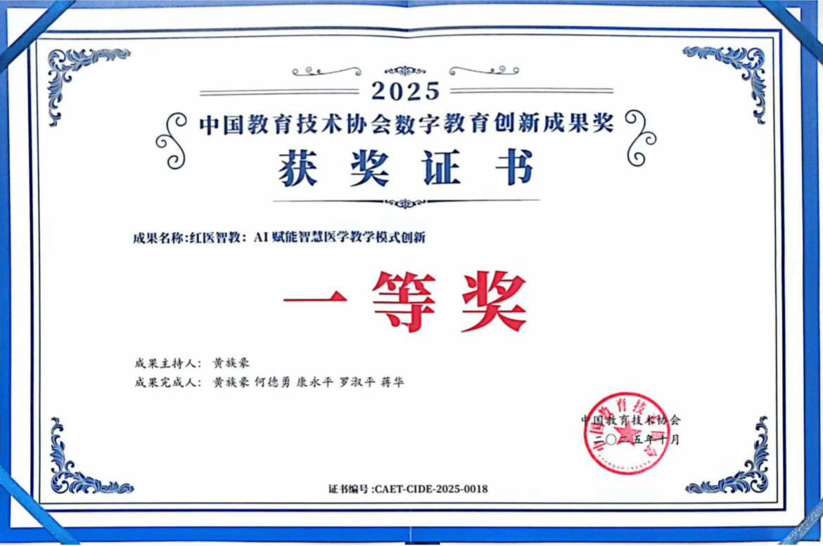 近日,中国教育技术协会公布了2025年数字教育创新成果奖评选结果,我校“红医智教:AI赋能智慧医学教学模式创新”成果荣获一等奖。