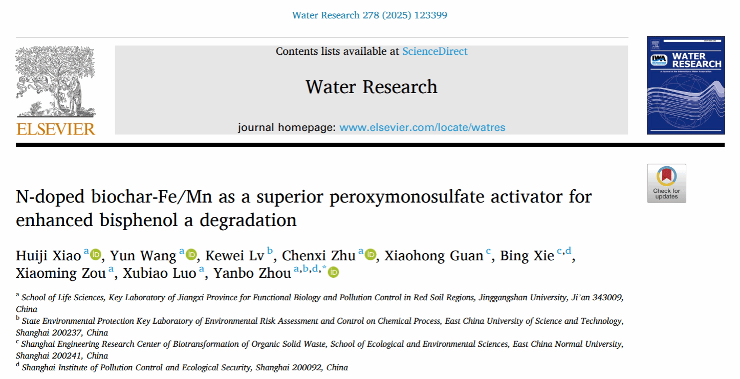 近日,我校周彦波教授团队在环境领域取得的重要研究成果“N-doped biochar-Fe/Mn as a superior peroxymonosulfate activator for enhanced bisphenol a degradation”成功入选最新一期ESI(基本科学指标)高被引论文和热点论文。该成果于2025年6月15日在环境科学与水研究领域国际顶级期刊《Water Research》(自然指数期刊,中国科学院一区TOP,IF2024 = 12.38)正式发表。论文以井冈山大学为第一单位,生命科学学院肖慧吉博士为第一作者,周彦波教授为通讯作者。