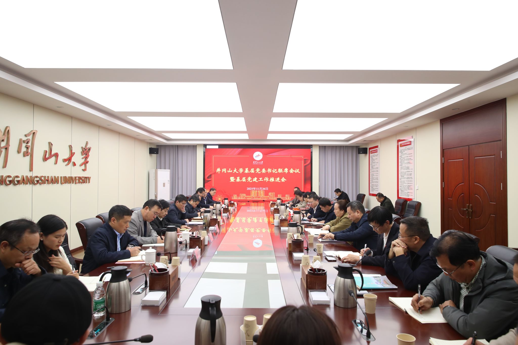 为推动基层党委书记主动履职尽责、担当作为,提升基层党建工作质量,11月26日,学校召开基层党委书记联席会议暨基层党建工作推进会。会议由党委书记罗旭彪主持。党委副书记肖宜安,党委常委、纪委书记彭西洪,党委常委、副校长敖四江,党委常委、副校长段学民,党委常委、宣传部部长肖洪海出席会议并分别作点评。党委常委、组织部部长梁景宏就基层党委职责定位、运行机制等相关文件制度进行解读,并部署近期学校党建重点工作。学校党建工作领导小组成员参加会议。