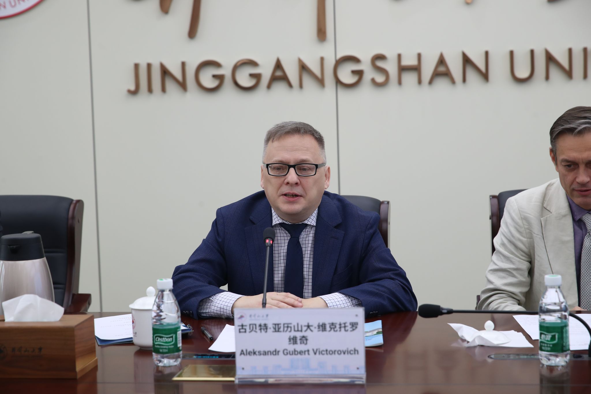 古贝特对我校的热情接待表示衷心感谢,对我校在项目招生录取、新生报名入学等工作中的辛勤付出表示由衷敬意。他指出,两校合作办学项目能如此快速获批并得以实施,取决于两校突出的办学实力和影响力。他强调,中俄两国互免签证政策的出台,为未来两校之间的交流与合作提供极大便利,他向井冈山大学师生发出诚挚的访俄邀请。
