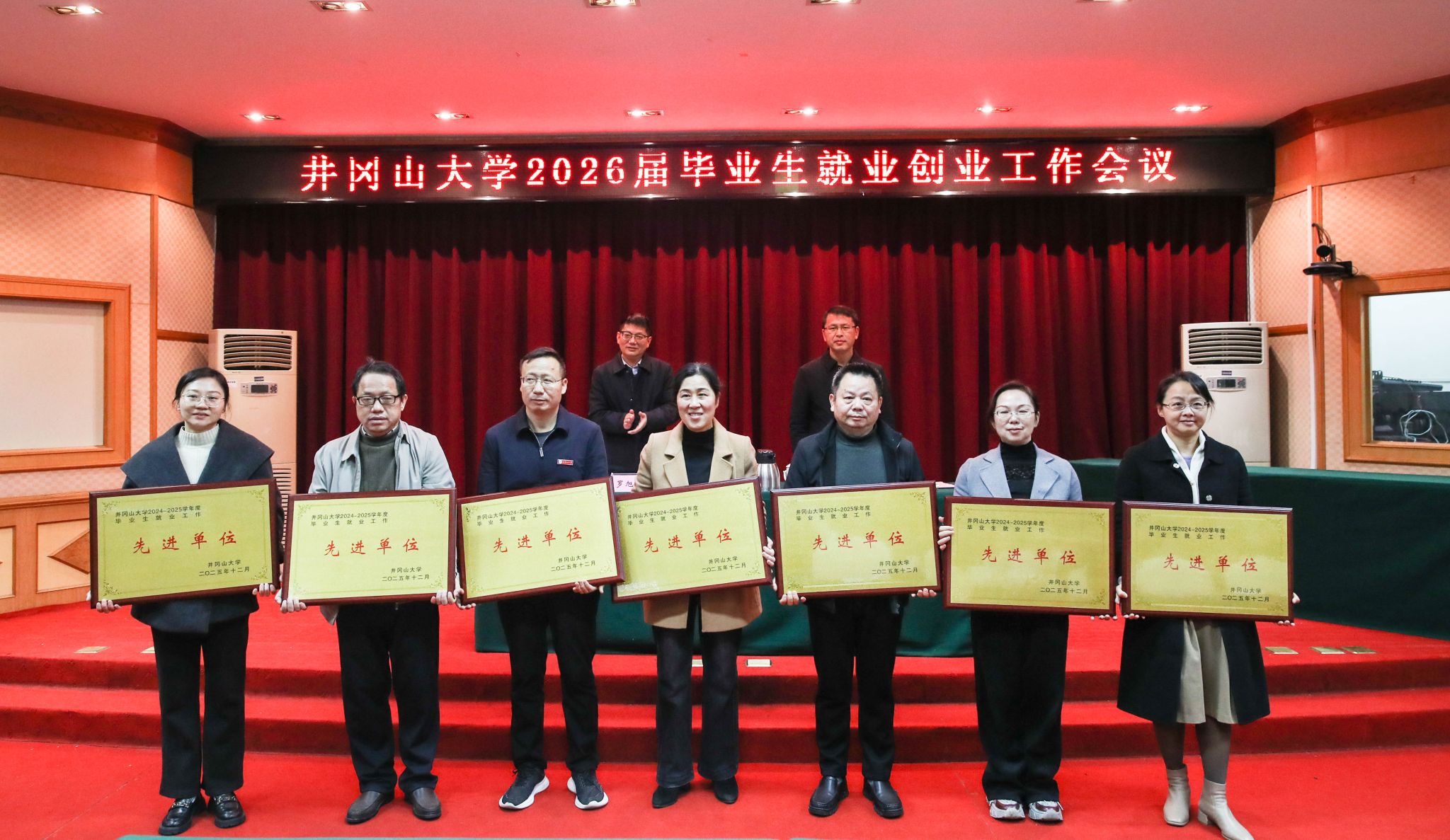 会议还宣读了学校2024-2025学年度毕业生就业工作表彰决定。校领导为机电工程学院等7个先进单位、孙乐等13名先进个人现场颁发奖牌与证书。获奖代表依次作交流发言,分享了在就业育人体系构建、就业市场开拓、困难群体精准帮扶等工作中的经验做法与实践心得,为全校就业工作提质增效提供了宝贵借鉴。