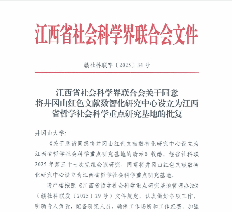 近日,江西省社会科学界联合会正式发文,同意将井冈山红色文献数智化研究中心设立为江西省哲学社会科学重点研究基地,标志着学校在红色文化研究与数智化融合领域迈出关键一步。