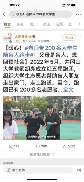 2022年5月,井冈山大学胡亮老师成立红五星跑团,组织大学生志愿者帮助盲人朋友走出家门,走上跑道。至今,跑团已有200多名志愿者。