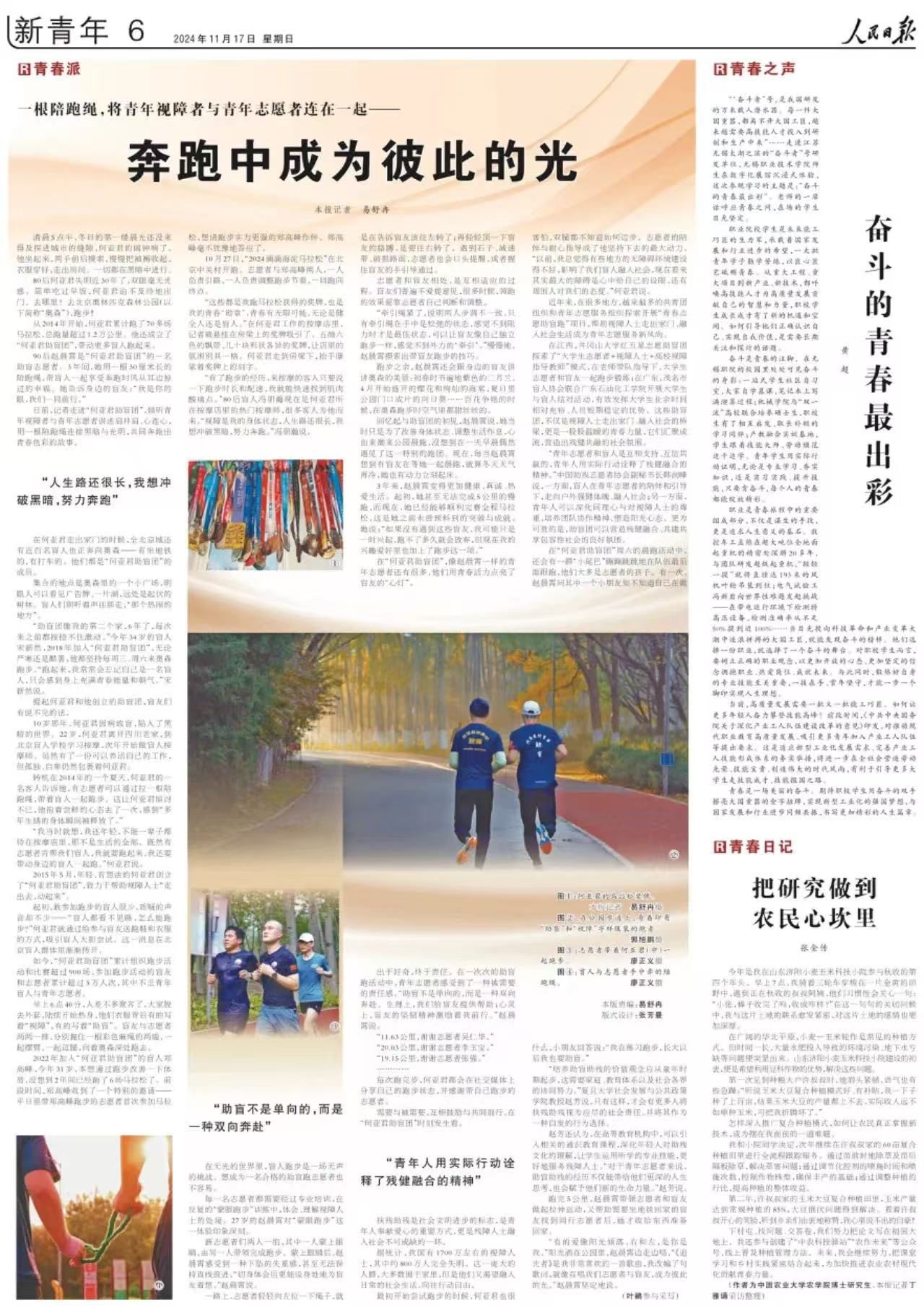 出于好奇,终于责任。在一次次的助盲跑活动中,青年志愿者感受到了一种被需要的责任感。“助盲不是单向的,而是一种双向奔赴。生理上,我们给盲友提供帮助;心灵上,盲友的坚韧精神激励着我前行。”赵晨霄说。