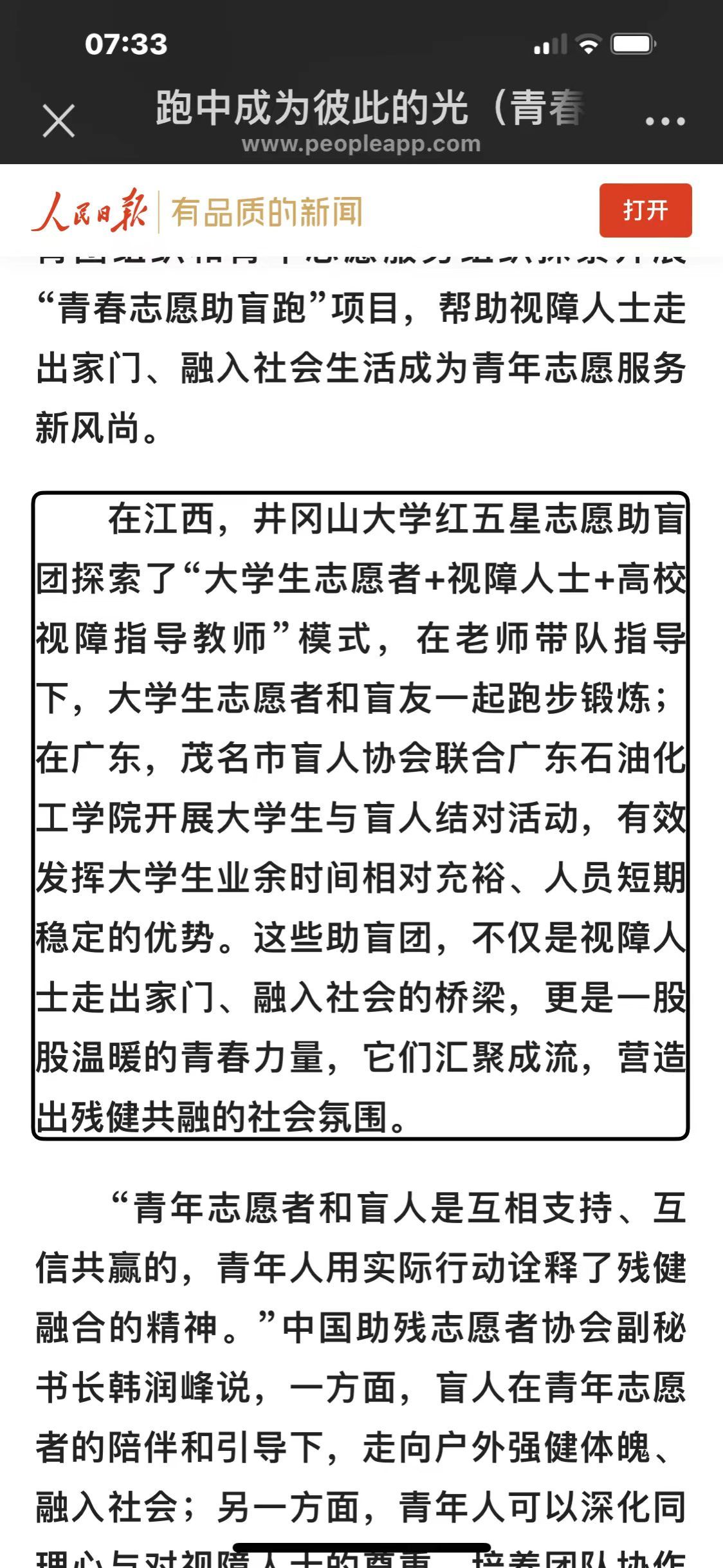 在江西,井冈山大学红五星志愿助盲团探索了“大学生志愿者+视障人士+高校视障指导教师”模式,在老师带队指导下,大学生志愿者和盲友一起跑步锻炼;在广东,茂名市盲人协会联合广东石油化工学院开展大学生与盲人结对活动,有效发挥大学生业余时间相对充裕、人员短期稳定的优势。这些助盲团,不仅是视障人士走出家门、融入社会的桥梁,更是一股股温暖的青春力量,它们汇聚成流,营造出残健共融的社会氛围。