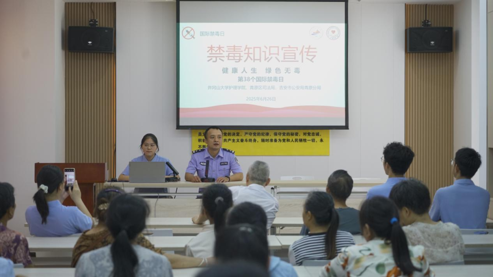 井冈山大学护理学院16名大学生走进青原区城北学校、东固民族黄公略红军中学、东固民族黄公略红军小学,为1200余名初中生开展禁毒课堂宣讲,通过大量的鲜活案事例向中小学生揭示毒品危害,帮助中小学生树立禁毒意识。