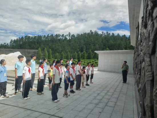 大学生志愿者带领小学生们手捧鲜花,神情庄重地缓步上前,向烈士墓敬献鲜花。全体人员肃立,默哀一分钟,以最诚挚的敬意,寄托对革命先烈的无限追思。“黄爷爷能听见我们说话吗?”一年级学生稚嫩地提问,道出对英雄的崇敬与好奇。大学生志愿者蹲下身子,温柔回应:“只要我们永远铭记他,他就会永远活在我们心中,他能听得见的。”这一问一答间,红色精神的种子已悄然种下。