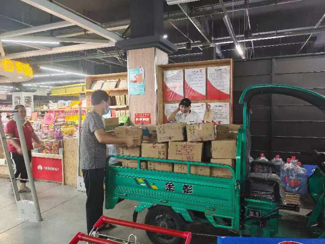 因为人手紧张,刘钟将每次带头和其他工作人员一起卸货。疫情期间物资供应困难,超市需求量大,要囤积大量物资,“每天都有大量物资运来,需要从车上卸下来,放到货架上,你看,还有这么多物资在这里。”刘钟将指着一车子的货物说着便和员工一起搬下物资,“在疫情刚开始那几天,每天最少要来5辆货车,每车4、5吨物资,我们根本忙不过来。”甚至在校园全封闭期间里,刘钟将每天忙到下午2点才吃午饭、晚上8点才吃晚饭。